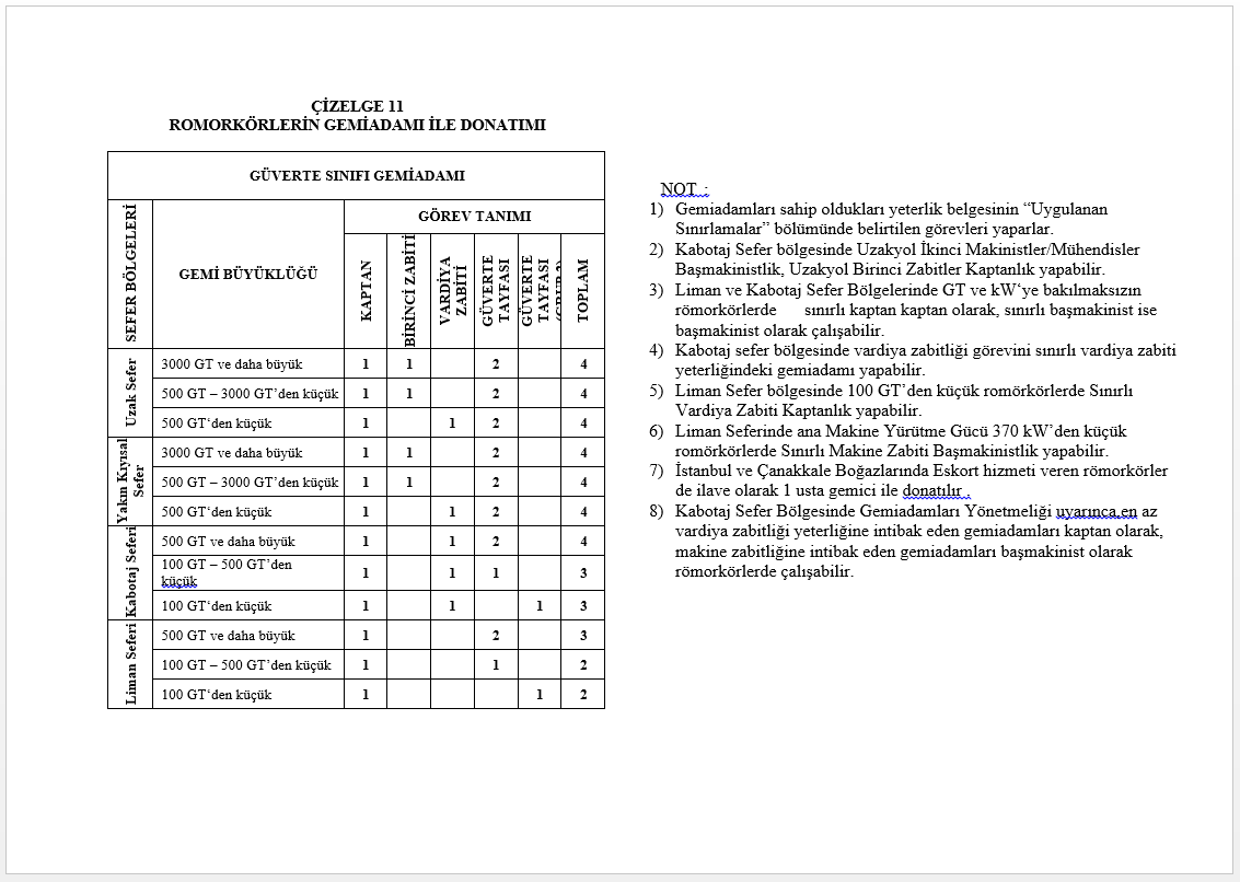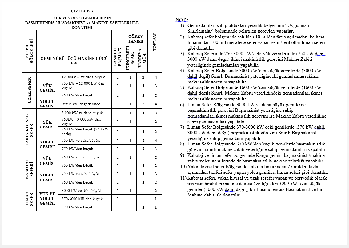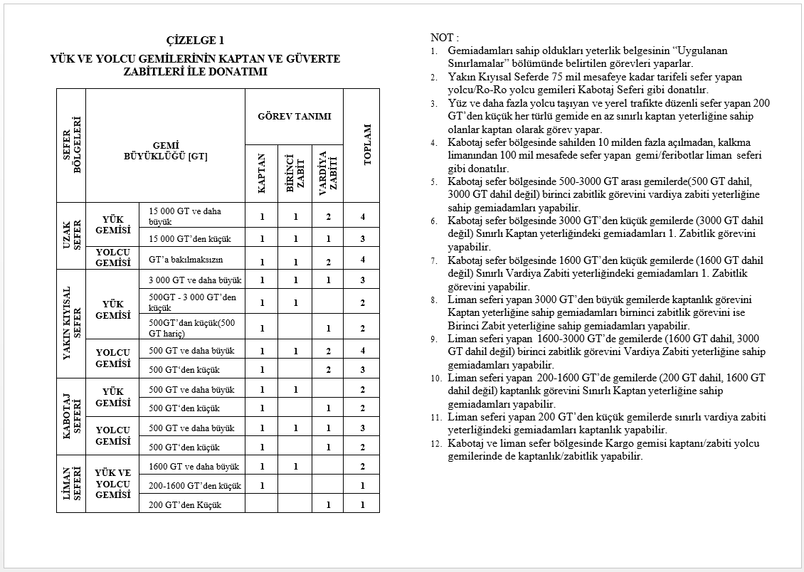 Bu belgede adı geçen gemi, aşağıdaki tabloda verilen sayı ve yeterlik/kapasitedeki gemiadamları ile donatıldığında; ulusal ve uluslararası mevzuata göre emniyetli donatılmış sayılır.