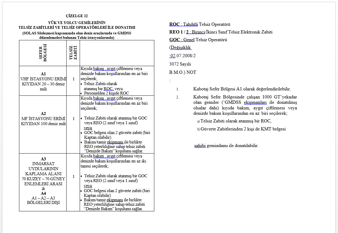 ** A–1 seyir alanlarında bir Tahditli Telsiz Operatörü (ROC) veya personelden iki kişide ROC bulunmalıdır. A-2-3-4 seyir alanlarında ise, en az bir Genel Telsiz Operatörü (GOC) bulunmalı veya kaptan ya da güverte zabitleri ile birlikte (güverte zabitlerinden birinin yerine Güverte Stajyeri olabilir) toplam 2 adet GOC yeterliği olmalıdır.