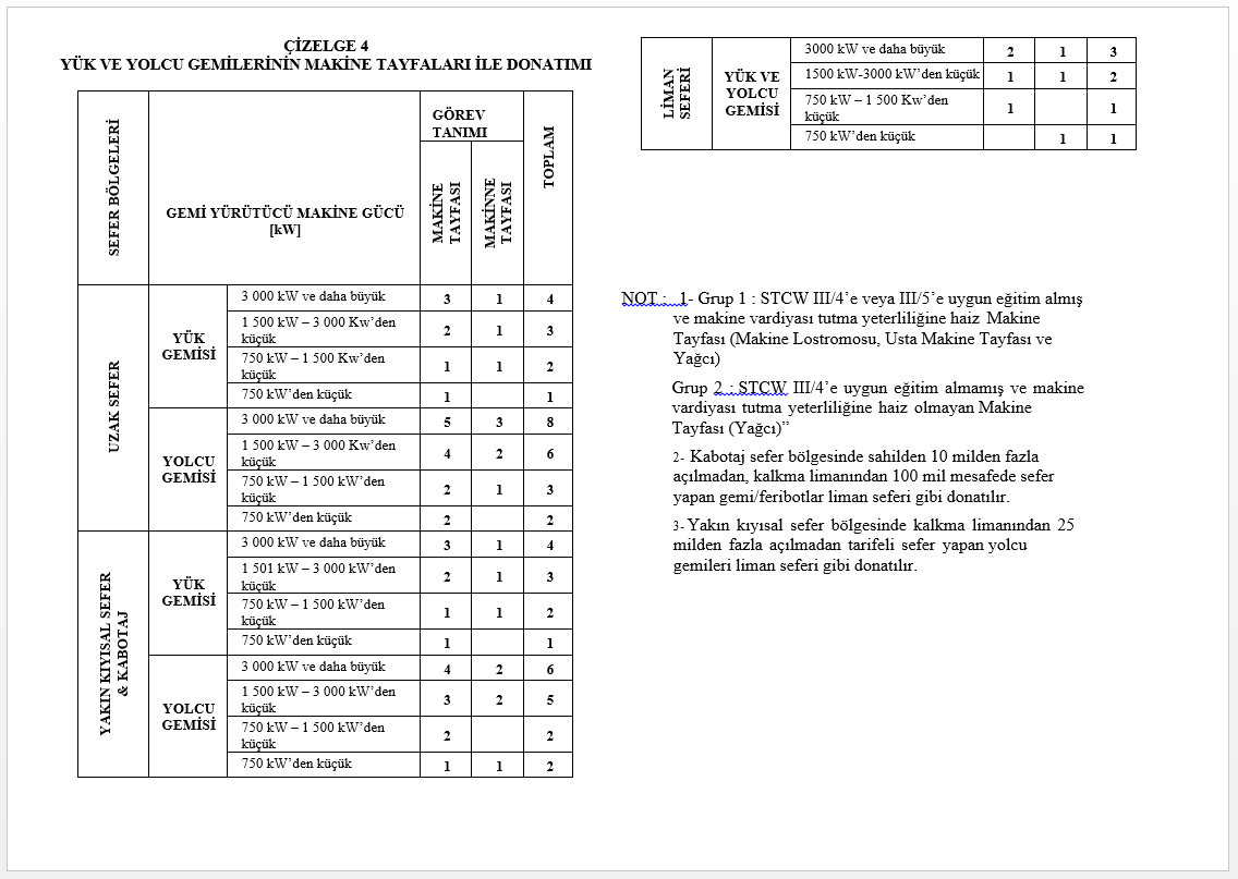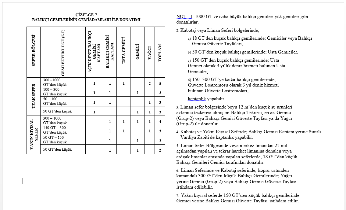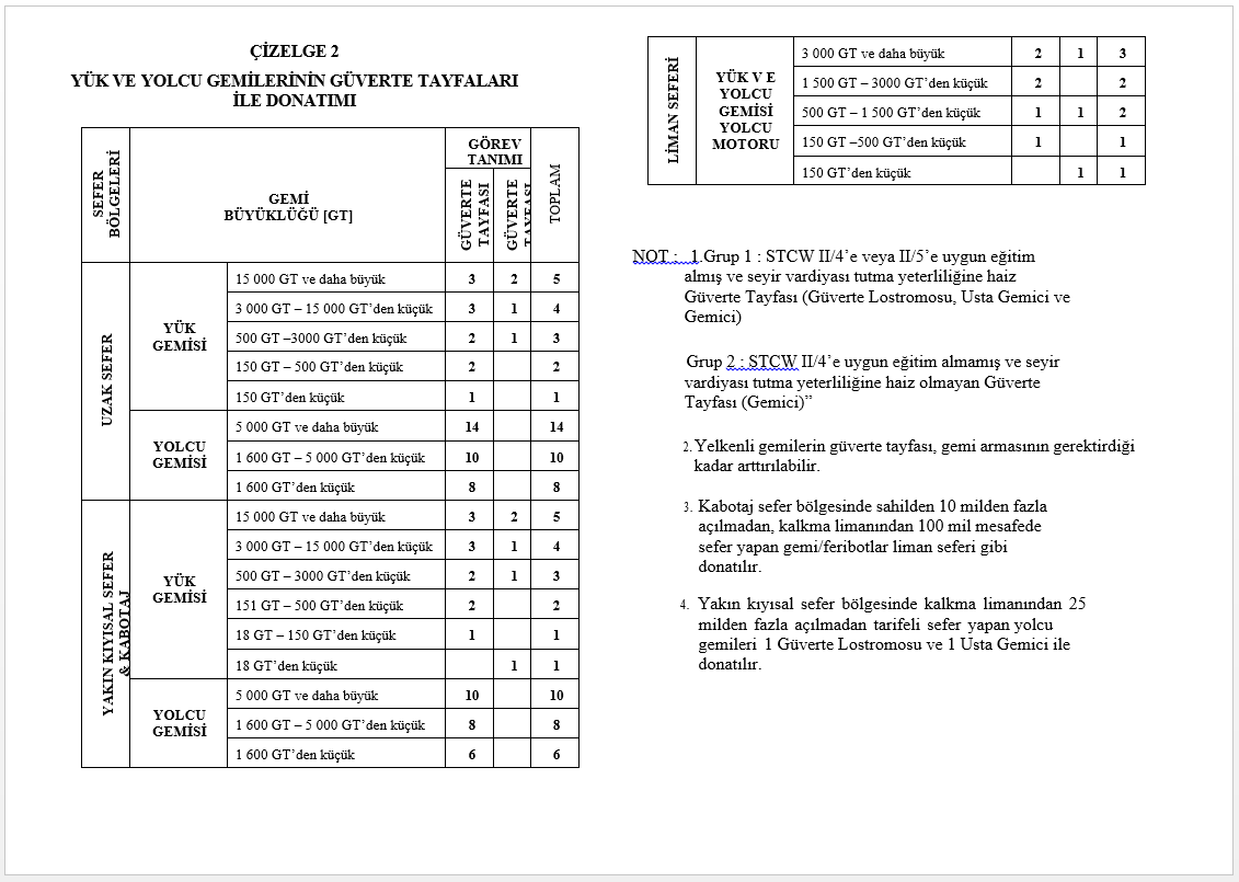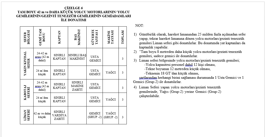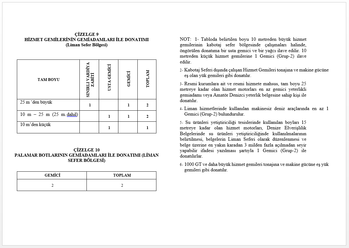 NOT: 1- Tabloda belirtilen boyu 10 metreden büyük hizmet gemilerinin kabotaj sefer bölgesinde çalışmaları halinde, öngörülen donatıma bir usta gemici ve bir yağcı ilave edilir. 10 metreden küçük hizmet gemilerine 1 Gemici (Grup-2) ilave edilir.